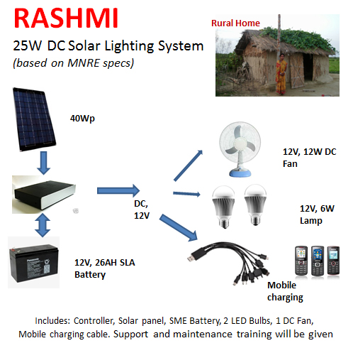 This system helps to have Power when it is most needed, specially after dusk, for children to study, for kitchen, small tasks at home. This Lighting system is best suitable for rural small houses like huts, very small shops, business This is small independent system of only DC power supply. The panel can be kept on the roof.System includes two LED bulbs and one DC fan. The system is indigenously developed in India by Banyan Link Co Japan.